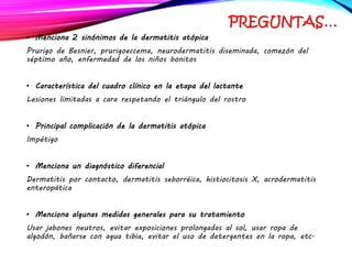 La dermatitis atópica es una enfermedad crónica de la piel que causa mucho picor. Generalmente comienza en la infancia y se caracteriza por brotes de lesiones eccematosas que tienden a mejorar y empeorar. El tratamiento incluye medidas para aliviar el picor y humectar la piel, así como corticoesteroides tópicos y sistémicos para controlar los brotes.