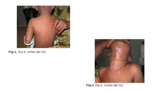 Un niño de 2 años presentó un brote de lesiones ampollares que comenzaron en la región sacra y se extendieron a la cara, cuero cabelludo y miembros, acompañadas de prurito intenso. La biopsia de piel mostró un infiltrado linfohistiocitario compatible con dermatitis herpetiforme, con depósito de IgA en la membrana basal. El tratamiento con baños antisépticos, difenhidramina, ceftriaxona, y dapsona produjo mejoría de las lesiones cutáneas y