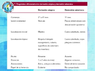 La dermatitis seborreica es una enfermedad inflamatoria de la piel que causa descamación en el cuero cabelludo, la cara y otras áreas. Tiene causas desconocidas pero se relaciona con factores infecciosos, neurológicos, inmunológicos y psicológicos. En bebés causa costra láctea y en adultos caspa y erupciones amarillentas. Se diagnostica por los síntomas y su tratamiento incluye corticoides tópicos y queratolíticos para remover es