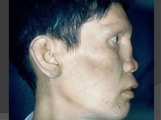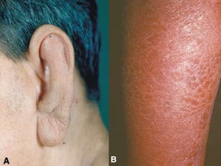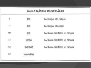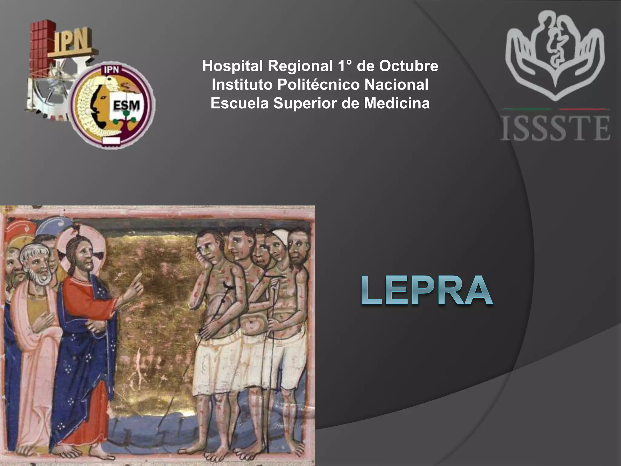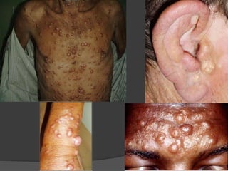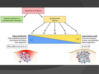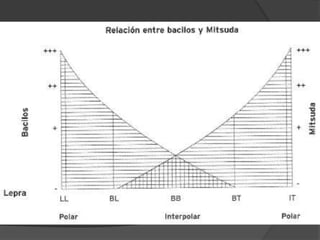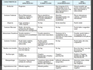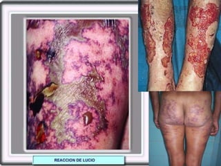 El documento trata sobre la lepra, una enfermedad infecciosa crónica causada por el Mycobacterium leprae, que afecta los nervios periféricos y presenta diferentes formas de clasificación según la respuesta inmunológica del paciente. Se describe la lepra lepromatosa, que es más progresiva y común en México, y la lepra tuberculoide, que presenta síntomas más limitados y se caracteriza por una buena respuesta inmune. También se abordan los diagnósticos, manifestaciones clínicas, reacciones e indicaciones de tratamiento para cada forma de la enfermedad.