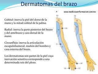 El documento describe los principales nervios del plexo braquial que inervan la piel y músculos del brazo y antebrazo, incluyendo el musculocutáneo, mediano, braquial cutáneo interno y su accesorio, cubital, radial y circunflejo. También explica que los dermatomas son áreas de la piel inervadas por una raíz específica del plexo braquial.