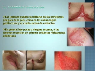 El documento describe las características de la psoriasis. En resumen: (1) La psoriasis es una enfermedad dermatológica frecuente que afecta hasta el 1-3% de la población mundial. (2) Tiene un componente hereditario y puede ser desencadenada por factores ambientales. (3) Se caracteriza clínicamente por placas eritematosas con escamas.