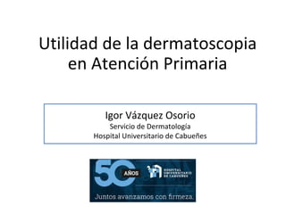 El documento describe la utilidad de la dermatoscopia en Atención Primaria. La dermatoscopia permite visualizar estructuras cutáneas no visibles a simple vista mediante una lente de aumento e iluminación. Se explican los tipos de dermatoscopio, parámetros dermatoscópicos como color y estructuras, y métodos diagnósticos como la regla de los tres puntos. La dermatoscopia es útil para el diagnóstico de lesiones melanocíticas y no melanocíticas siempre que se complemente con la historia clínica y exploración