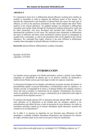 Este documento describe los criterios para clasificar los derrames pleurales como trasudados u exudados. Explica que el criterio de Light, que evalúa los cocientes de proteínas totales y lactato deshidrogenasa entre el líquido pleural y el suero, es el método más efectivo para diferenciar entre exudados y trasudados. También describe las características y causas más comunes de cada tipo de derrame pleural. Finalmente, analiza algunos marcadores bioquímicos adicionales y limitaciones en la clasificación de los