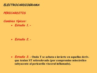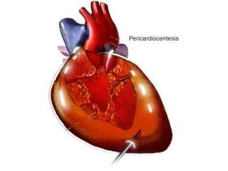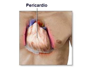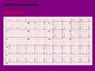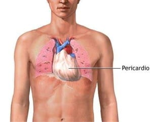 El documento aborda las enfermedades del pericardio, sus funciones y condiciones relacionadas, como la pericarditis aguda y el derrame pericárdico, explicando sus síntomas y diagnósticos. Se detallan los tratamientos disponibles y los procedimientos diagnósticos, así como las causas comunes de pericarditis, incluyendo infecciones, neoplasias y reacciones a fármacos. Además, se menciona la importancia del diagnóstico adecuado y el seguimiento en pacientes con derrame pericárdico de causa desconocida.