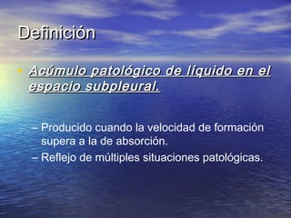 Este documento describe el derrame pleural, definiéndolo como la acumulación patológica de líquido en el espacio subpleural. Explica la fisiología normal del espacio pleural y los mecanismos por los cuales puede acumularse líquido de forma anormal. Además, detalla los tipos de derrame pleural, las manifestaciones clínicas, los estudios de imagenología y la importancia de realizar una toracocentesis para diagnosticar la causa subyacente.