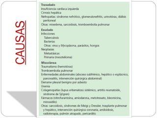 Este documento define el derrame pleural como la acumulación de líquido en la cavidad pleural. Explica que puede ocurrir cuando hay un exceso de formación de líquido o una disminución en su reabsorción por los linfáticos. Distingue entre trasudado y exudado pleural y proporciona criterios de Light para diferenciarlos. También describe las causas, síntomas, exámenes y tratamiento del derrame pleural, incluida la toracocentesis y el avenamiento pleural.