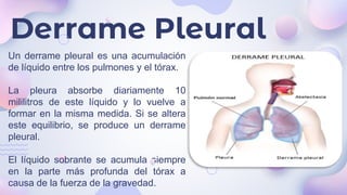 Este documento trata sobre el derrame pleural. Brevemente resume que un derrame pleural es una acumulación de líquido entre los pulmones y el tórax. Explica las causas más comunes como derrames trasudativos, derrames/empiema paraneumónico, derrames pleurales malignos, derrames por tromboembolias pulmonares y pleuritis tuberculosa. También cubre el diagnóstico, exámenes y tratamiento de un derrame pleural.
