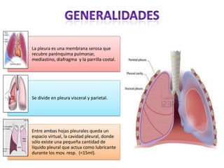 El documento describe la pleura, la membrana que recubre los pulmones y la cavidad torácica. Explica que entre las hojas pleurales hay un espacio que contiene una pequeña cantidad de líquido pleural. Luego describe las causas de derrame pleural, incluyendo aumento de la filtración del líquido pleural, disminución de su drenaje o absorción, y movimiento de líquido desde otros lugares del cuerpo. Finalmente, detalla los métodos para diagnosticar y clasificar diferentes tipos de derrame pleural.