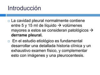 Este documento describe el derrame pleural, incluyendo su fisiopatología, diagnóstico y tratamiento. Explica que un derrame pleural ocurre cuando hay más de 15 ml de líquido en la cavidad pleural y que su estudio requiere una detallada historia clínica, examen físico e imágenes. Describe los análisis de laboratorio que se realizan en el líquido pleural para determinar su causa, incluyendo recuentos celulares, enzimas y cultivos. Finalmente, explica el tratamiento y pronóstico