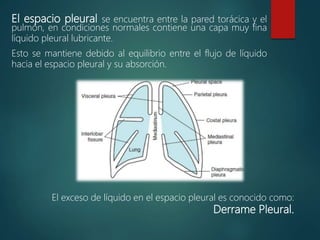 El documento describe el derrame pleural, que ocurre cuando hay un exceso de líquido en el espacio pleural. Explica que el derrame puede ser un trasudado o un exudado, dependiendo de si la pleura está dañada o no. Las causas más comunes de derrame pleural son la insuficiencia cardíaca y las neumonías bacterianas. El diagnóstico incluye radiografías de tórax y análisis del líquido pleural obtenido mediante toracocentesis.