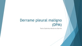 Este documento describe el derrame pleural maligno (DPM), que ocurre cuando una enfermedad maligna causa la acumulación anormal de líquido entre la pleura y la cavidad torácica. Explica que las causas más comunes son el cáncer de pulmón, mama, linfoma y ovario, y que aproximadamente el 50% de los pacientes con tumor maligno metastásico desarrollarán un DPM. También describe los síntomas, exámenes de diagnóstico e implicaciones del DPM.