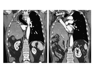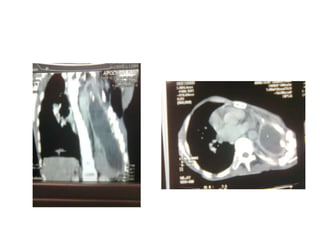 Este documento describe los criterios para determinar cuándo un derrame pleural constituye una emergencia médica. Un derrame pleural masivo, definido como más de 1,5 litros de líquido en un hemitórax que causa desplazamiento del mediastino contralateral, insuficiencia respiratoria u hemodinámica, requiere tratamiento de emergencia como la colocación de un tubo de tórax. El documento también discute los signos radiológicos de un derrame pleural masivo y las opciones de tratamiento.