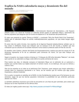 Científicos derriban los mitos sobre una supuesta profecía maya que predecía un cataclismo o cambio de conciencia humana para el 21 de diciembre de 2012. Un historiador explica que la profecía surgió en los años 70 pero que los mayas no creían que su tiempo terminaría en 2012 y que su calendario solo marcaba el fin de un ciclo. La NASA publicó un video explicando que el calendario maya ha sido malinterpretado y que no hay evidencia de que indique el fin del mundo.