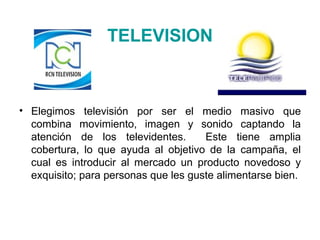 El documento describe la estrategia de publicidad para un nuevo producto en diferentes medios como televisión, revistas, radio, prensa, vallas publicitarias e internet durante los meses de enero, febrero y marzo. Se especifican los programas, emisoras y publicaciones en los que se realizarán las pautas publicitarias, así como los formatos, frecuencias y costos asociados a cada medio.