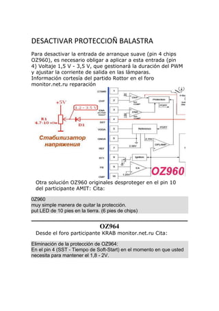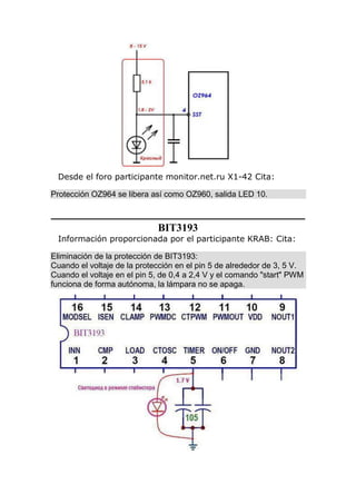 Este documento proporciona instrucciones para desactivar las protecciones en varios controladores PWM comunes utilizados en monitores y televisores, incluyendo OZ960, BIT3193, TL1451, FAN7314, MP1008, OZ9938Q, AT1741, BD9897FS, TA9687GN, BD9883, OZ99361, y muchos otros. Las técnicas incluyen conectar LEDs, resistencias u otros componentes entre pines específicos de los chips y la tierra para anular las protecciones.