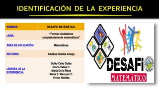 Este documento describe una estrategia pedagógica llamada "El Desafío Matemático" implementada en una institución educativa para mejorar el aprendizaje de las matemáticas. La estrategia utiliza competencias y pruebas similares a un reality show de televisión para motivar a los estudiantes. A lo largo de nueve años, la estrategia ha ayudado a mejorar los resultados en matemáticas y fomentar valores como el trabajo en equipo.