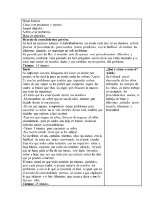 Este documento presenta una secuencia didáctica de actividades para clases de matemáticas en educación primaria. La secuencia se centra en problemas aditivos y se llevará a cabo con estudiantes de primer grado. Incluye ejercicios para desarrollar el sentido numérico y el pensamiento algebraico de los estudiantes, así como juegos y problemas basados en un supermercado simulado para practicar sumas y restas. El objetivo es que los estudiantes aprendan a modelar y resolver diferentes tipos de problemas aditivos de manera