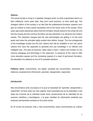 El documento aborda la necesidad de 'aprender, desaprender y reaprender' en un mundo en constante cambio, donde los conocimientos se vuelven obsoletos rápidamente debido a la velocidad de los avances tecnológicos. La educación continua y a distancia se presentan como soluciones clave para que los ciudadanos se adapten y se conviertan en agentes activos del conocimiento en la sociedad. Se enfatiza el nuevo rol de los docentes que deben innovar pedagógicamente, integrando nuevas tecnologías y metodologías de enseñanza más efectivas.