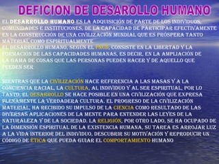 El documento define el desarrollo humano como la adquisición de capacidades por parte de individuos, comunidades e instituciones para participar en la construcción de una civilización próspera tanto material como espiritualmente. Según el PNUD, el desarrollo humano consiste en la libertad y formación de capacidades humanas. El documento luego describe las etapas del desarrollo humano como prenatal, infancia, niñez, adolescencia, juventud, adultez y ancianidad.