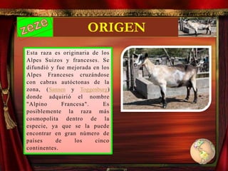 La raza alpina de cabras se originó en los Alpes franceses a través del cruce de cabras saanen y toggenburg. Es una raza de tamaño medio que se cría principalmente para la producción lechera. Las cabras alpinas pesan entre 60-80 kg y los machos entre 80-100 kg. Su pelaje puede ser de diversos colores como blanco, negro, café o manchado. Suelen tener cuernos en forma de cimitarra y orejas erguidas.