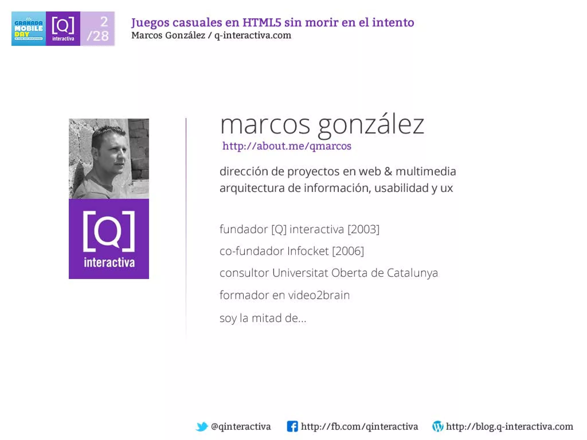 En esta ponencia que tuvo lugar en el Granada Mobile Day de 2014, tuvimos la suerte de poder exponer una combinación de librerías que aproximan y facilitan sobre manera el desarrollo de juegos casuales a todos los que provienen de un entorno basado en Flash Professional. Para los que no tienen ese backround, es una combinación igualmente aconsejable, ya que se puede usar de forma completa o parcial, siendo cada uno de los tres componentes explicados: createjs, typescript y gsap perfectamente válido de forma independiente. CreateJS Este set de librerías en JavaScript nos permite interactuar con el elemento Canvas de una forma totalmente análoga a como se realizaba en Flash. Además incorpora capacidades para trabajar con audio, con la precarga de contenido y recursos y animación. TypeScript Sin duda el punto más importante de todos para desarrollos basados en JavaScript de envergadura, ya que es el que tiene menos alternativas de todos. Este superset de JavaScript permite obtener tras la compilación código JS 100% compatible con los navegadores, limpio y organizado... por lo tanto nos traslada muchas de las ventajas de un lenguaje compilado sin tener un impacto en el código final. Con TypeScript dispondrás de tipado estricto de datos, nuevos tipos de datos adicionales, sintaxis de OOP real, interfaces, clases, herencia, módulos, imports, etc. permitiendote crear estructuras fácilmente ampliables y sostenibles en JavaScript dentro de proyectos complejos. GSAP Esta librería de animación es sin duda la referencia número 1 a tener en cuenta cuando se quiere trabajar con elementos del DOM, de Canvas, de CreateJS o incluso para otras funcionalidades que permite. El rendimiento y capacidades superan notablemente al resto de librerías similares, estando en la actualidad solamente cerca de ella Velocity.js en cuanto a rendimiento, no así en funcionalidadess. Con esta combinación hoy en día es posible desarrollar proyectos de complejidad media en HTML5 y JavaScript, con un flujo de trabajo profesional (incluyendo nodeJs y grunt para el trabajo con typescript) y una mejora notable en la eficiencia del desarrollo.