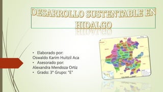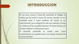 Este documento trata sobre el desarrollo sustentable en el estado de Hidalgo, México. Explica que el desarrollo sustentable implica crecimiento económico con equidad social y uso racional de recursos naturales. También describe cómo una organización llamada Espacios Naturales y Desarrollo Sustentable A.C. fue fundada en 1995 para promover alternativas de producción sustentable. Finalmente, resume que el gobierno de Hidalgo está trabajando para establecer un modelo de vivienda sustentable que mejore el bienestar