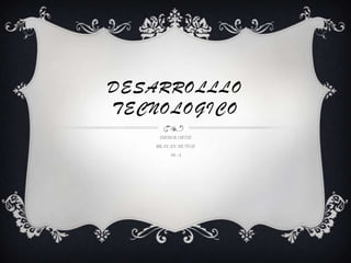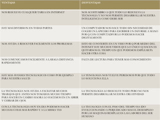 Este documento resume las ventajas y desventajas del desarrollo tecnológico, así como posibles soluciones a las desventajas. Algunas ventajas incluyen que la tecnología resuelve tareas y problemas fácilmente y mejora la comunicación a distancia. Algunas desventajas son que puede hacernos dependientes de ella y menos creativos. Las soluciones propuestas incluyen dividir nuestro tiempo entre la tecnología y actividades manuales para desarrollar nuestras habilidades.