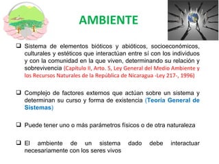 Este documento presenta diferentes definiciones y conceptos generales sobre el medio ambiente. Define el ambiente como un sistema de elementos bióticos, abióticos, socioeconómicos, culturales y estéticos que interactúan y determinan la relación y supervivencia de los individuos y la comunidad. También lo describe como el complejo de factores externos que actúan sobre un sistema y determinan su curso. Finalmente, explica que el ambiente implica todo lo que nos rodea, incluyendo el entorno físico, biológico, social, cultural y econ