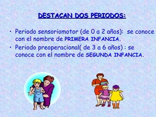 Este documento describe dos periodos clave en el desarrollo infantil: el periodo sensoriomotor (de 0 a 2 años) y el periodo preoperacional (de 3 a 6 años). En el primer periodo, los niños desarrollan habilidades motoras y el lenguaje a través de sonidos y palabras. En el segundo periodo, los niños comienzan a interactuar socialmente a través del juego y su lenguaje se vuelve más complejo con el uso de oraciones. El documento también discute el desarrollo de la inteligencia, la motricidad y los hábit