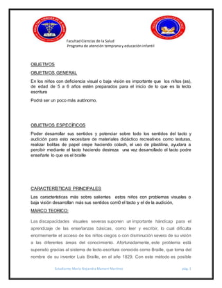 El documento presenta información sobre el aprendizaje del sistema Braille en niños con deficiencia visual entre 5 y 6 años. Los objetivos son desarrollar sus sentidos del tacto y la audición para prepararlos para la lectoescritura. Se describen actividades para potenciar estas habilidades y el proceso de alfabetización en Braille, incluyendo el reconocimiento de puntos y letras Braille. Finalmente, se mencionan las ventajas de este sistema para permitir que personas ciegas lean y escriban y su potencial para favorecer la integración y aut