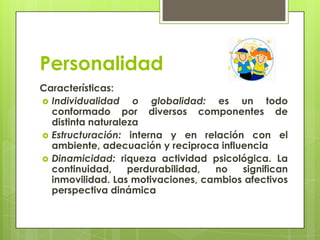 Este documento describe las características del desarrollo de la personalidad en niños de 3 a 12 años. Durante este periodo, los niños pasan por etapas de individualismo, cooperación con otros, comprensión de reglas sociales, y pensamiento más abstracto. La familia y la escuela juegan un papel importante en enseñar valores y patrones de conducta a través de la imitación y la enseñanza directa.