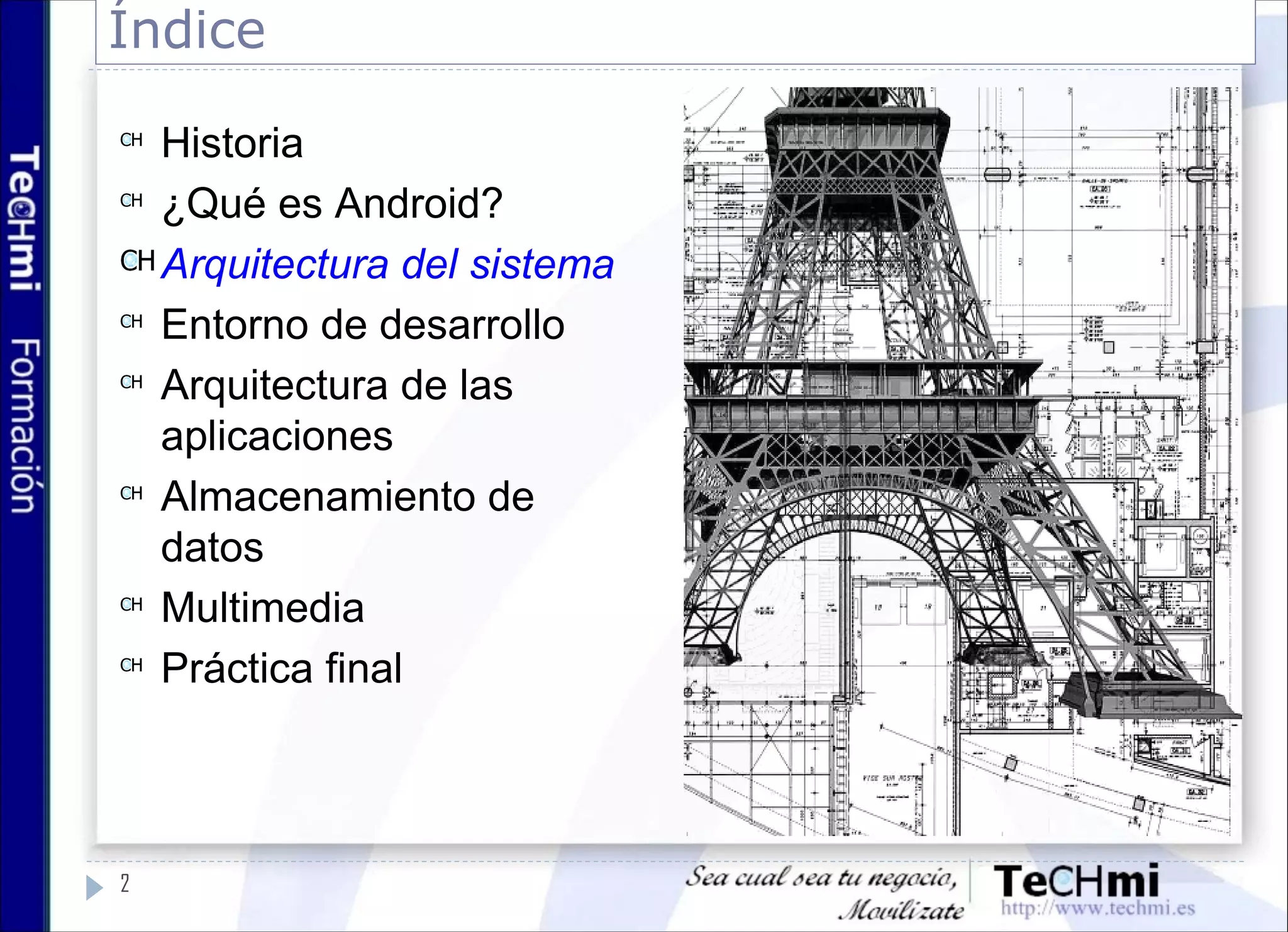 Android se basa en el kernel de Linux y utiliza la máquina virtual Dalvik para ejecutar aplicaciones escritas en Java. El framework de aplicaciones proporciona APIs para acceder a los dispositivos y servicios. Las aplicaciones se distribuyen a través de Android Market.