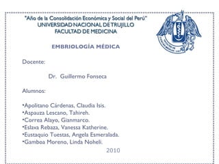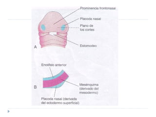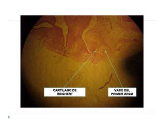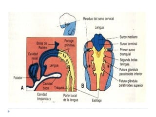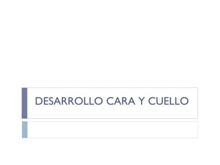 El documento describe el desarrollo de la cara y el cuello durante las primeras etapas embrionarias, incluyendo la formación de los arcos faríngeos, las bolsas faríngeas y sus derivados, así como el desarrollo de la lengua, el paladar, la glándula tiroides y otras estructuras craneofaciales.