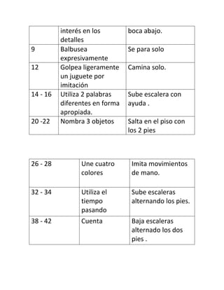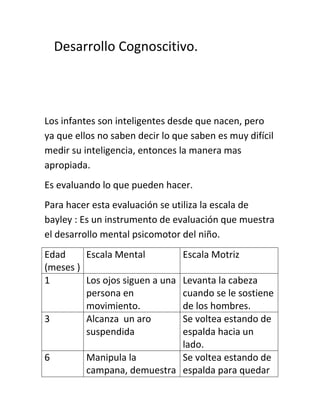 El documento presenta información sobre el desarrollo cognitivo de los infantes. Explica que la escala de Bayley es un instrumento que evalúa el desarrollo mental y psicomotor de los niños mediante dos escalas: la Escala Mental, que analiza el desarrollo cognitivo y la capacidad de comunicación, y la Escala Motriz, que analiza el control del cuerpo y la coordinación. También resume brevemente la teoría de Piaget sobre las etapas del desarrollo cognitivo.