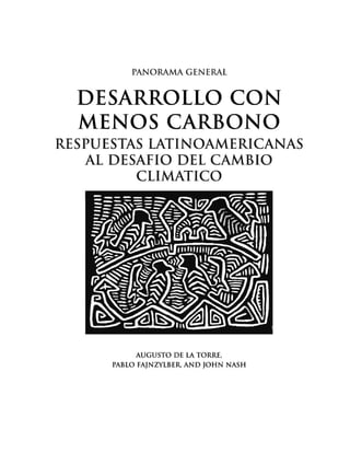 Este documento presenta un resumen del libro "Desarrollo con Menos Carbono: Respuestas Latinoamericanas al Desafió del Cambio Climático". Incluye secciones sobre los impactos del cambio climático en América Latina y el Caribe, la necesidad de una respuesta global coordinada al cambio climático, el potencial de América Latina y el Caribe para mitigar el cambio climático a través de políticas de bajo carbono, y conclusiones sobre cómo lograr un futuro de alto crecimiento y bajas emisiones de carbono.