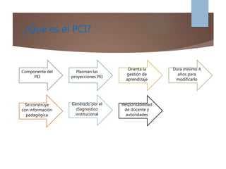Este documento presenta los elementos clave de la Planificación Curricular Institucional (PCI) de una universidad en Ecuador. Explica que la PCI es un componente del Proyecto Educativo Institucional que orienta la gestión del aprendizaje y se construye a partir de la información pedagógica y el diagnóstico institucional. Describe los pasos para construir la PCI, incluyendo el análisis del currículo, diagnóstico y lineamientos, así como los elementos fundamentales de la planificación curricular como el enfoque pedagógico, conten
