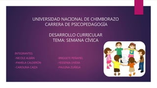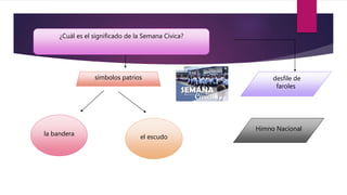 Este documento trata sobre el tema de la Semana Cívica. Brevemente describe el significado de la Semana Cívica y los símbolos patrios que se enseñan. También menciona que la Semana Cívica involucra a miembros activos de la comunidad y que los estudiantes se comprometen a trabajar por el desarrollo de sus entornos. Finalmente, propone una guía de reconocimiento para trabajar temas relativos a la Semana Cívica a nivel comunal.
