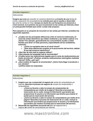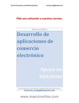 Este documento presenta una solicitud de cotización para servicios de asesoría y resolución de ejercicios en ciencias. Proporciona información de contacto vía correo electrónico y sitio web para obtener más detalles sobre los servicios ofrecidos, como asesoría, desarrollo de aplicaciones de comercio electrónico y apoyo en la resolución de ejercicios.