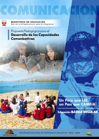 Este documento presenta la propuesta pedagógica del Ministerio de Educación del Perú para desarrollar las capacidades comunicativas de los estudiantes como parte del programa de emergencia educativa. Reconoce que existe un problema con las habilidades comunicativas de los estudiantes y establece como objetivo principal mejorar las capacidades de expresión y comprensión oral y escrita, así como la producción de textos. La propuesta se basa en un enfoque comunicativo e intercultural que prioriza el desarrollo de estas capacidades a través de experiencias de apre