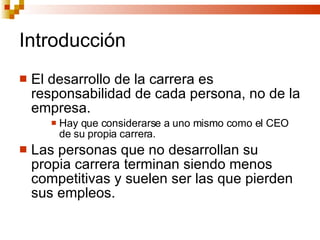 El documento trata sobre el desarrollo de la carrera laboral. Resalta que la responsabilidad del desarrollo de carrera recae en el individuo y no en la empresa. También menciona que las empresas deben comunicar su estrategia y proveer retroalimentación a los empleados, mientras que los empleados deben conocer sus habilidades. Por último, enfatiza la importancia de que los individuos manejen activamente su propia carrera a lo largo de su vida laboral.