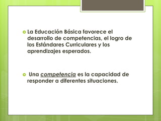 El documento habla sobre el desarrollo de competencias en la educación básica a través del logro de estándares curriculares y aprendizajes esperados. Define competencias, estándares curriculares y aprendizajes esperados, y explica cómo los materiales educativos como acervos, materiales audiovisuales e informáticos pueden usarse para favorecer el aprendizaje.