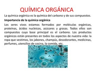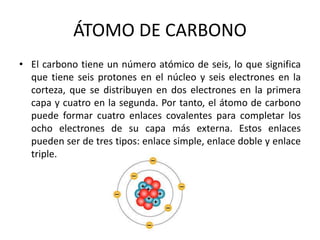 Este documento trata sobre química orgánica y átomos de carbono. Explica que la química orgánica estudia el carbono y sus compuestos, los cuales son esenciales para los seres vivos. Describe las propiedades del átomo de carbono y su capacidad para formar enlaces simples, dobles y triples. Además, introduce los hidrocarburos alcanos, alquenos y alquinos indicando sus fórmulas generales.