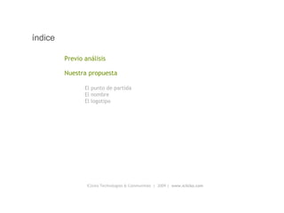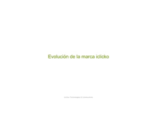 El documento describe la evolución del nombre y logotipo de la marca Iclicko. Explica que se analizaron grandes marcas internacionales como referencia y que se buscaba un nombre corto, reconocible y único para una empresa que desarrolla comunidades de usuarios en internet. Se decidió utilizar la palabra "click" en referencia a hacer clic con el mouse en una computadora y combinarla con los conceptos de "input" y "output" para crear el nombre "Iclicko".