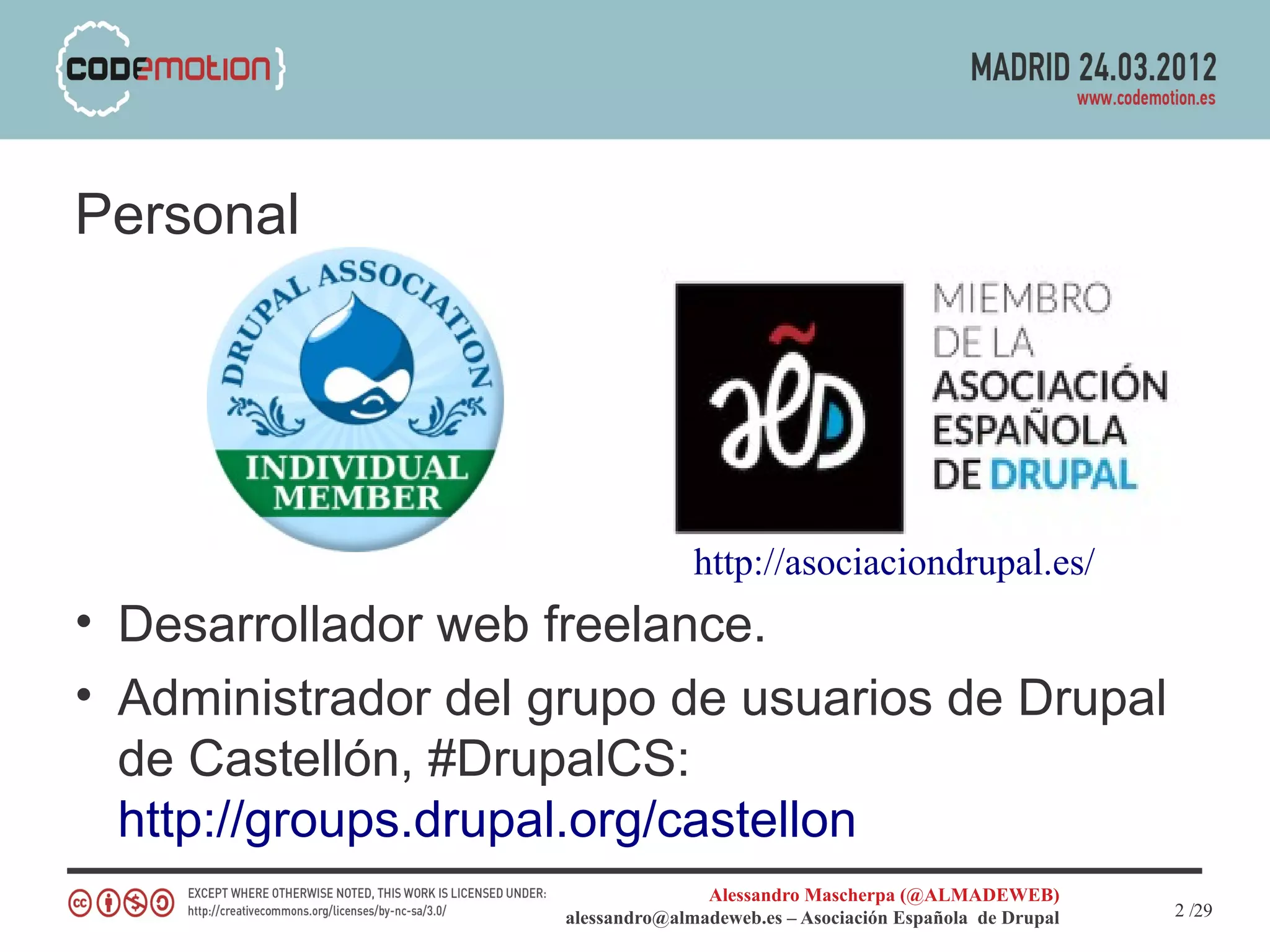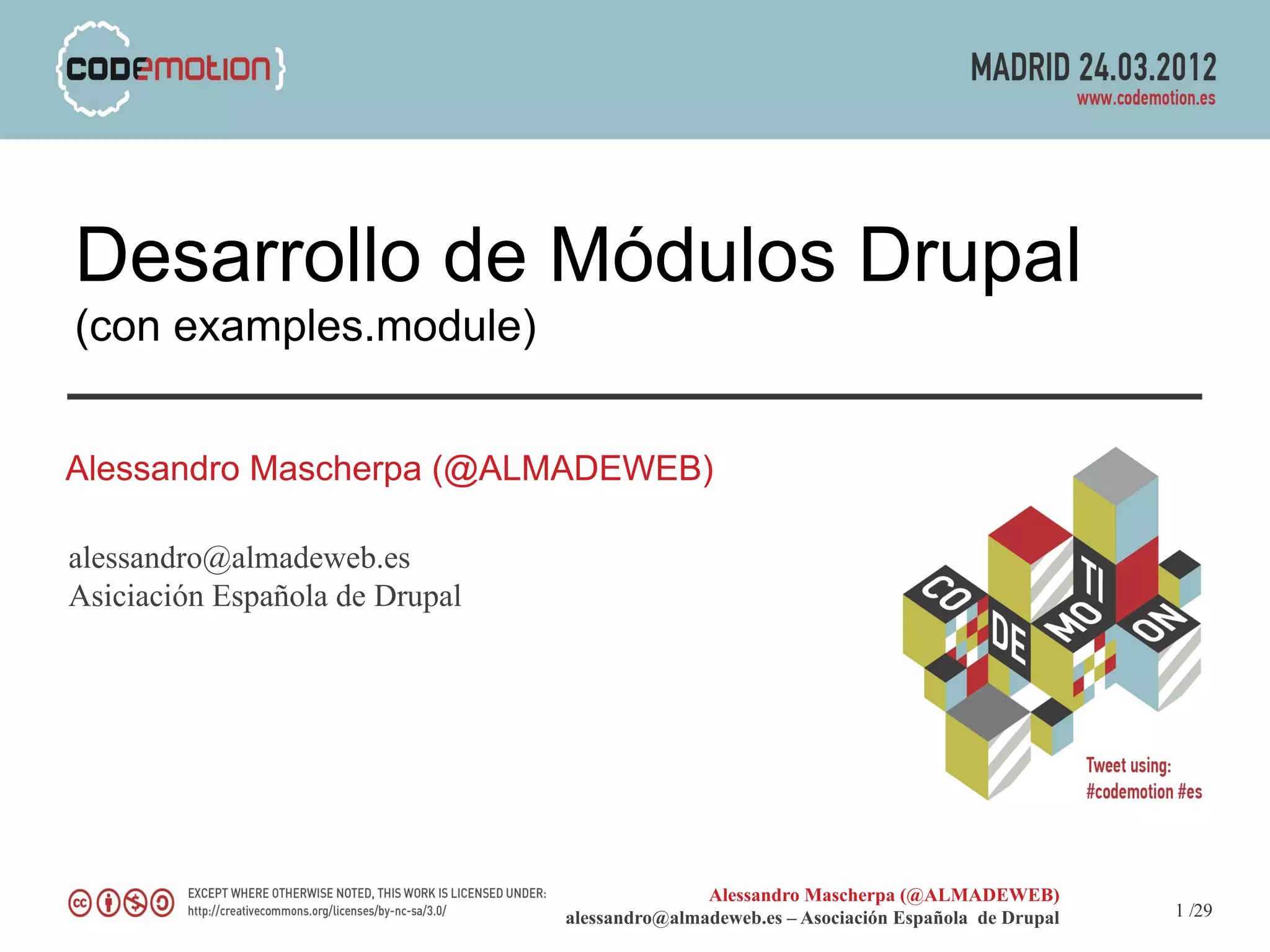 El documento proporciona una guía sobre el desarrollo de módulos en Drupal, incluyendo arquitectura, hooks y el uso del 'examples.module'. Se abordan aspectos técnicos como la API de Drupal, formación de formularios y gestión de esquemas de base de datos. Además, se mencionan herramientas útiles y recursos de la comunidad Drupal para apoyar el desarrollo.