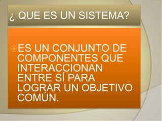 Este documento describe los conceptos básicos de los sistemas y el desarrollo de software. Define un sistema como un conjunto de componentes que interactúan para lograr un objetivo común y describe los tipos de sistemas abiertos y cerrados. Además, explica el ciclo de vida del software, incluidas las fases de análisis, diseño, construcción, pruebas e implementación. Finalmente, cubre temas como los requisitos, usuarios, herramientas de modelado de datos y metodologías de desarrollo de sistemas.