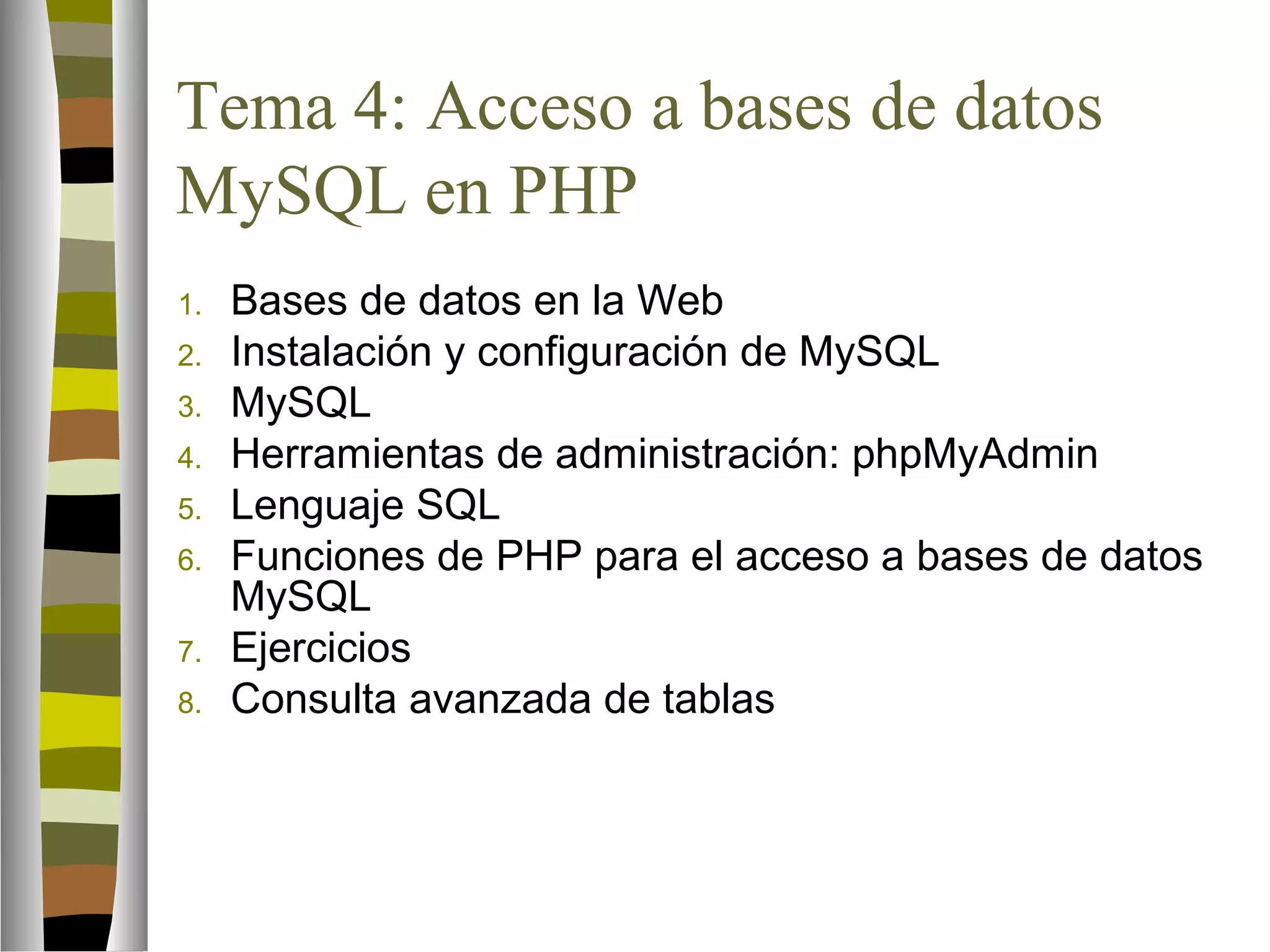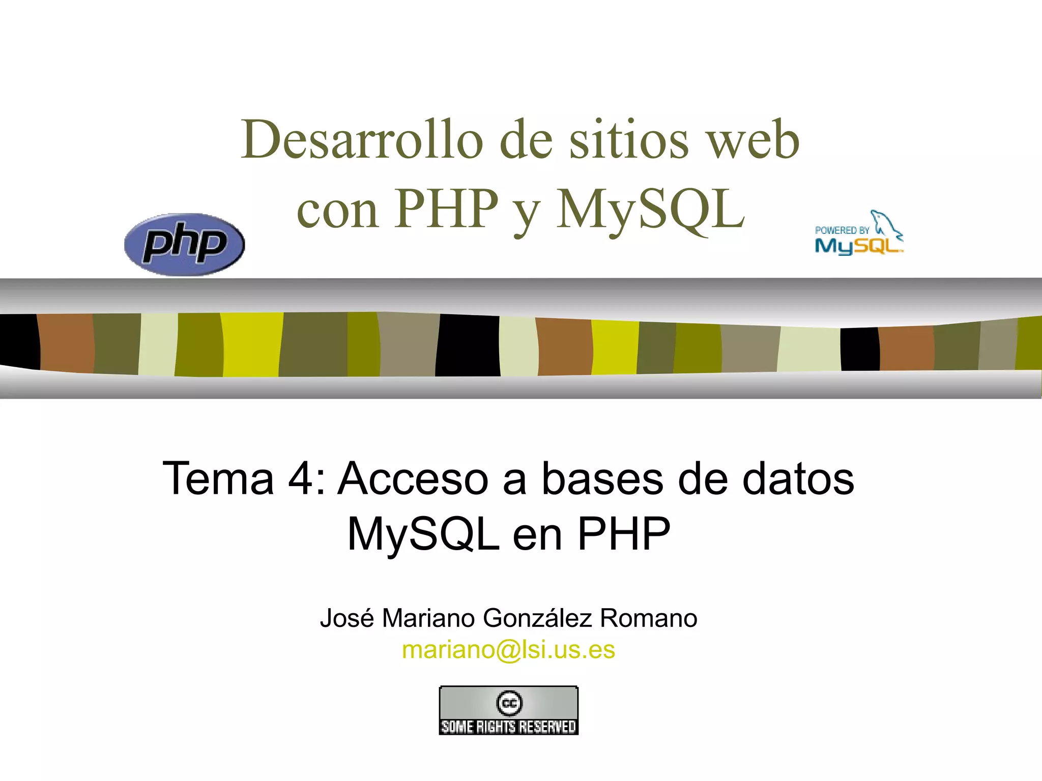 Este documento trata sobre el acceso a bases de datos MySQL desde PHP. Explica cómo instalar MySQL y phpMyAdmin, conectarse a la base de datos desde PHP usando funciones como mysql_connect(), mysql_query() y mysql_fetch_array(), y el uso del lenguaje SQL para consultas, inserciones, actualizaciones y eliminaciones.
