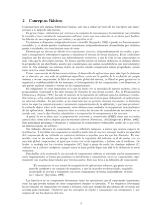 Este documento presenta los conceptos fundamentales del desarrollo de software basado en componentes. Introduce los conceptos de sistemas abiertos y distribuidos, y cómo la programación orientada a objetos no es suficiente para estos sistemas. Propone la programación orientada a componentes como un paradigma que permite el desarrollo de componentes reutilizables. Define los conceptos clave de componente, modelo de componentes y plataforma de componentes.