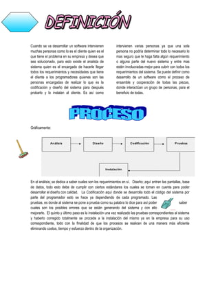 El desarrollo de software involucra a múltiples personas, incluyendo al cliente, analista de sistemas y programadores. El cliente identifica el problema, el analista determina los requerimientos y el programador desarrolla el código. Es un proceso colaborativo donde cada parte interactúa para crear un sistema que satisfaga las necesidades del cliente.