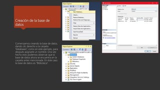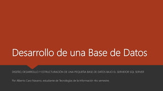 El documento detalla el proceso de diseño y desarrollo de una base de datos llamada 'biblioteca' en SQL Server, incluyendo la creación de esquemas, tablas y la inserción de datos. Se describe la creación de tablas para alumnos, usuarios y libros, especificando las columnas y tipos de datos correspondientes. Finalmente, se menciona la creación de un snapshot para guardar el estado de la base de datos.
